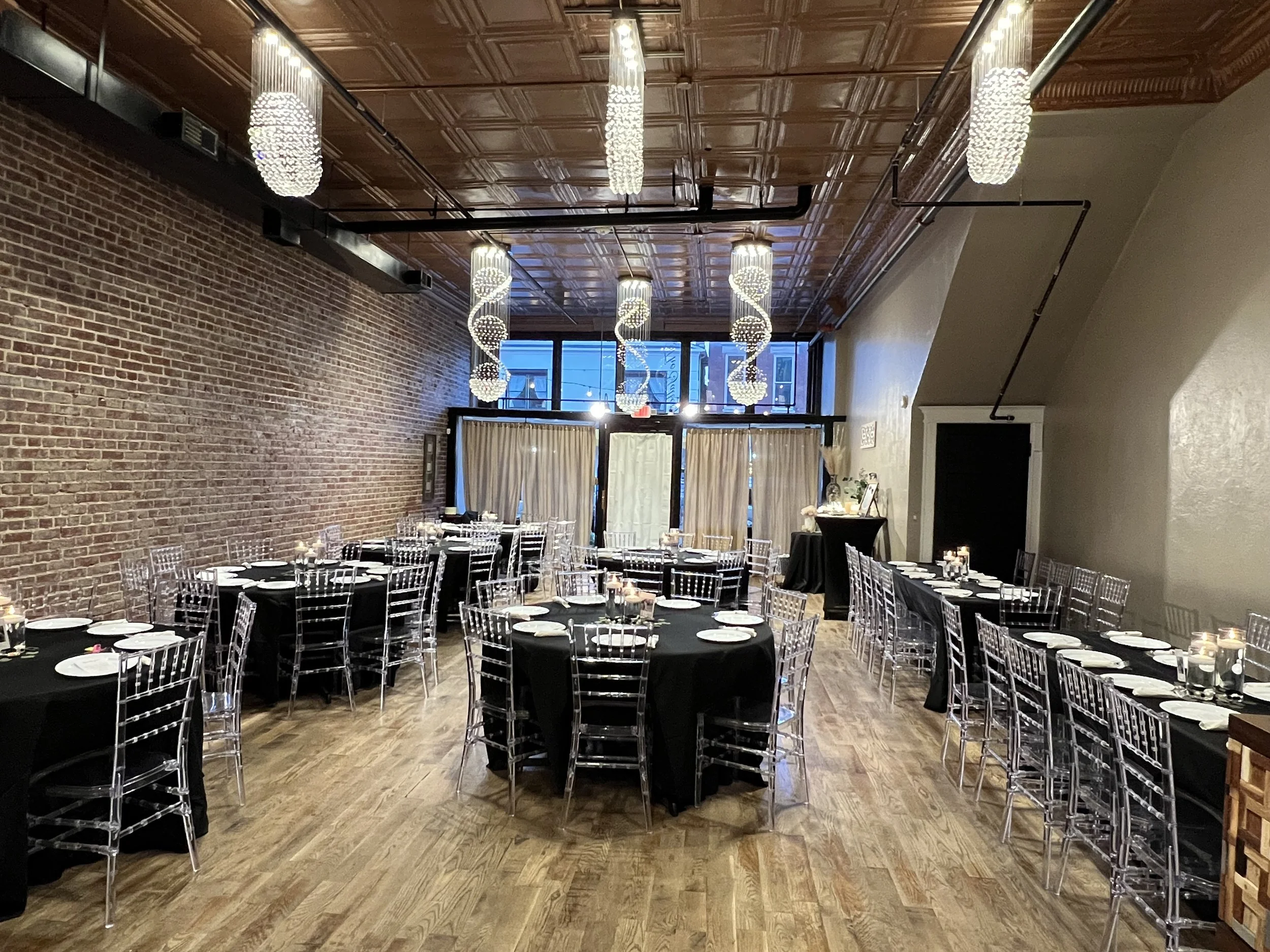 Elegant event space with round tables covered with black tablecloths, clear acrylic chairs, and small candles on each table. The ceiling has modern chandelier lights, and the walls are a mix of exposed brick and painted drywall. Large windows at the back with closed curtains, and hardwood floors.